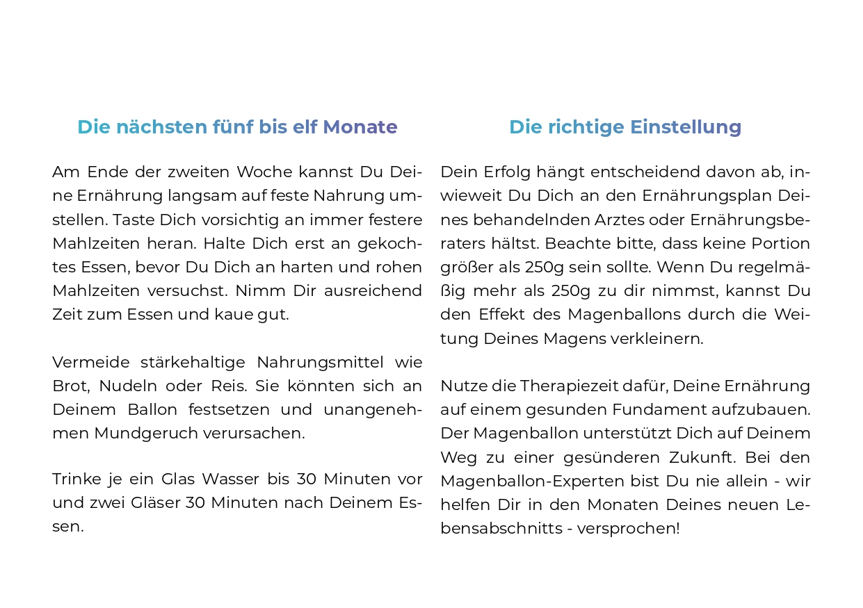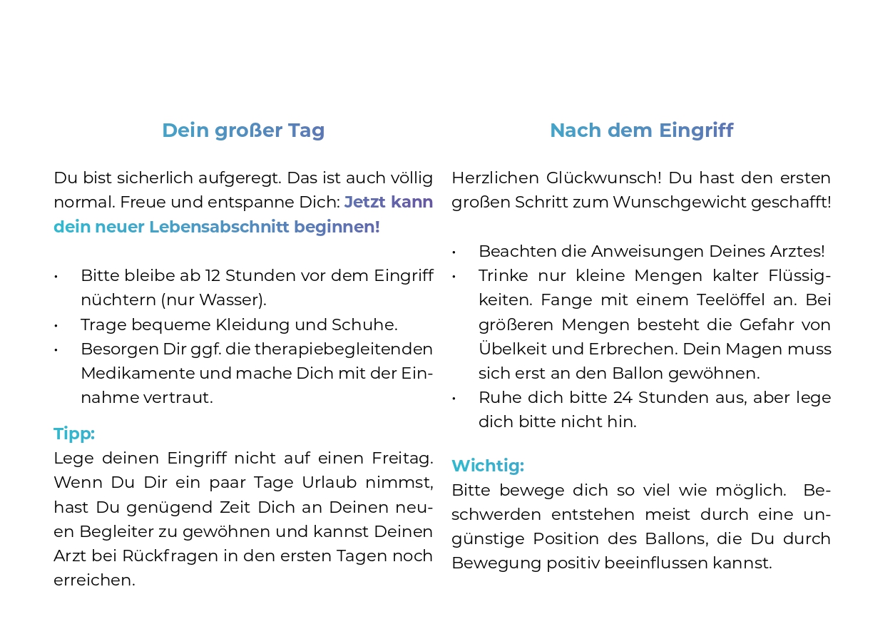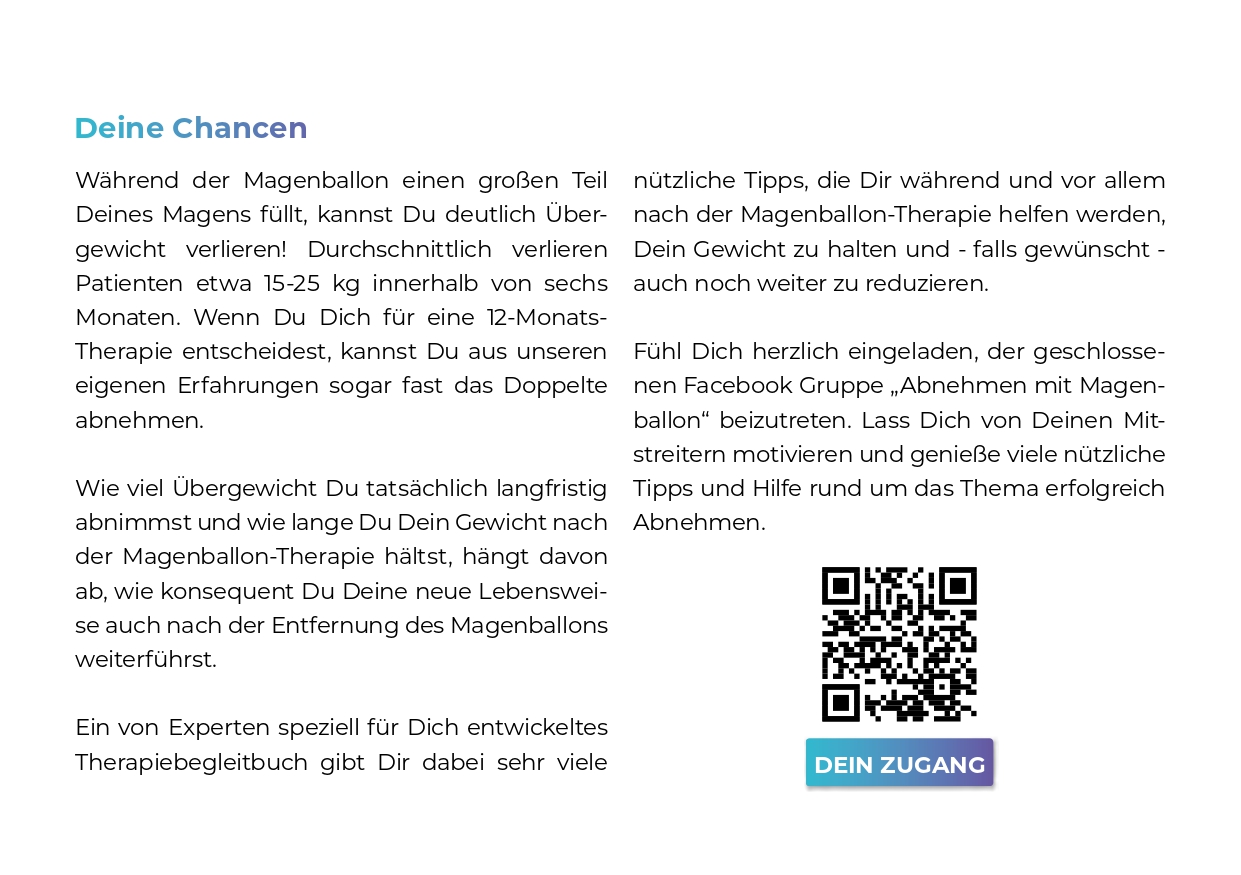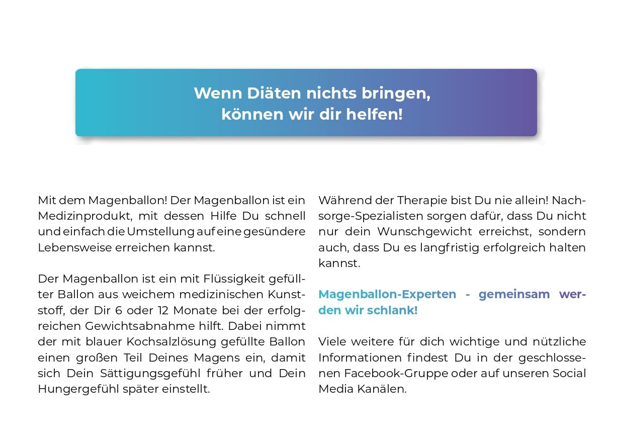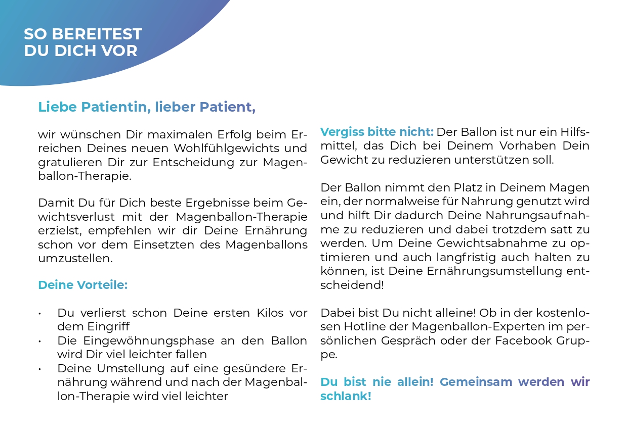 Wusstest Du, dass Du dir auch ganz einfach kostenlos und unverbindlich ein Informationspaket zur Magenballon-Therapie nach Hause schicken lassen kannst? Darin sind alle für dich wichtigen und nützlichen Informationen, ein Beratungsgutschein (nicht an allen Standorten) und auch die Kontaktdaten zum Magenballon-Experten in Deiner Nähe. Bestens vorbereitet, kannst Du dich dann in Deiner Praxis über Deine Möglichkeiten mit dem Magenballon aufklären lassen.