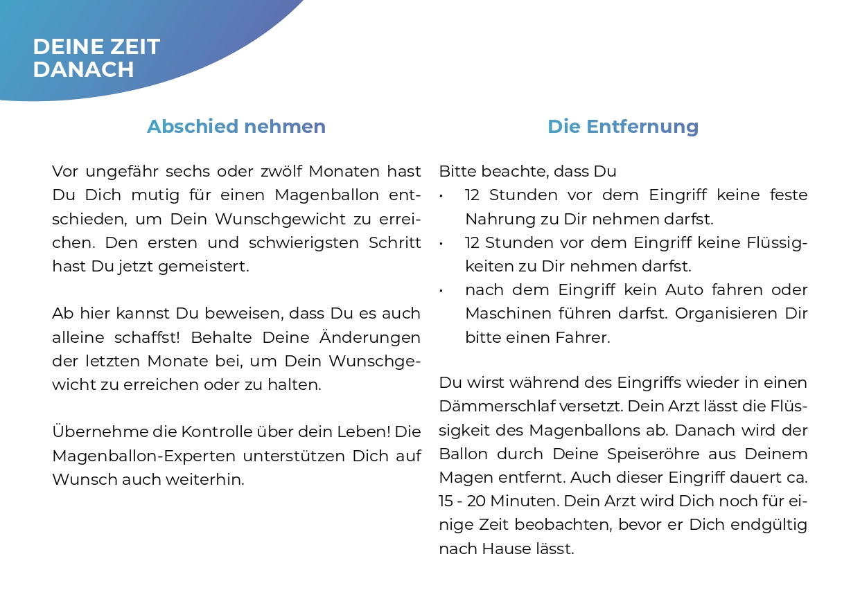 Je nach Variante verbleibt der Magenballon zwischen 6 und 12 Monaten im Magen.