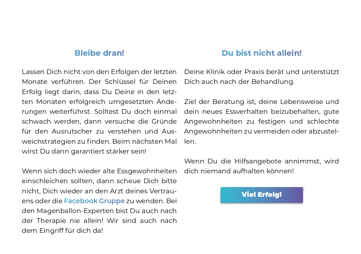 Ja. Während der Tragedauer lernen Sie ein neues Essverhalten. Das erleichtert es Ihnen, auch nach Entfernung des Ballons einen gesünderen Lebensstil beizubehalten.