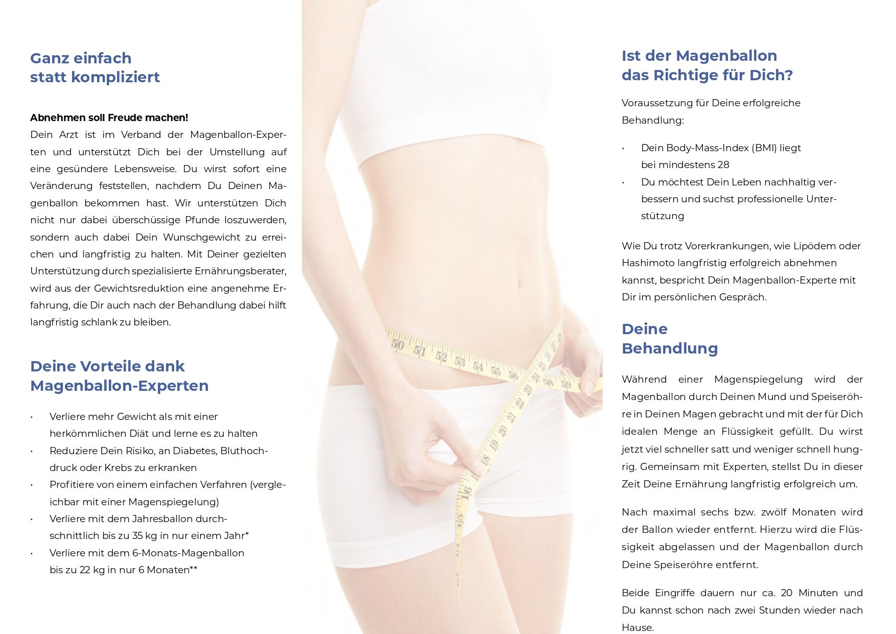 Ein Magenballon ist ein weicher aus medizinischem Silikon bestehender Ballon. Seit mittlerweile 30 Jahren wird der Magenballon erfolgreich eingesetzt. Das Prinzip ist sehr simpel. Der Magenballon wird während einer kurzen Magenspiegelung in den Magen eingesetzt und dort mit 400-700ml befüllt. In den kommenden 6-12 Monaten erlernst Du dank Magenballon und der Nachsorge Deines Magenballon-Expertens ein neues Essverhalten. Patienten werden schon von kleineren gesünderen Portionen satt und sind viel weniger schnell hungrig. Durchschnittlich nehmen Patienten 15-20 Kilo mit einem 6-Monats-Magenballon ab. Mit einem Spatz Jahresballon sind sogar Abnehmerfolge bis zu 35 kg möglich.